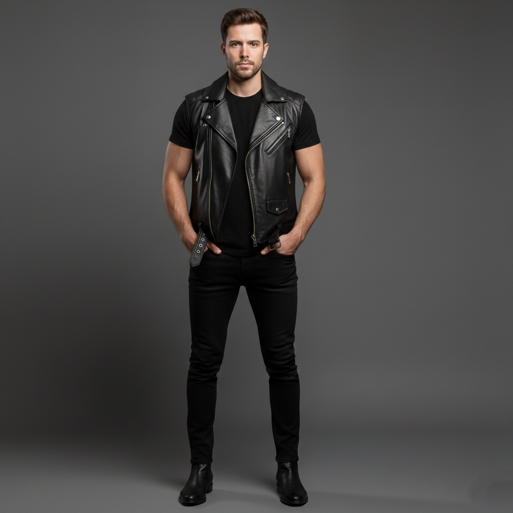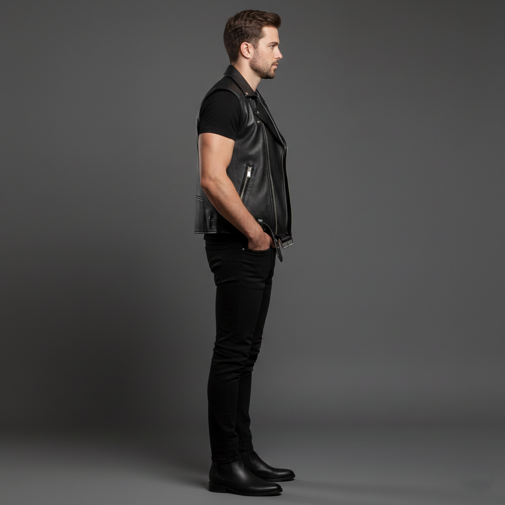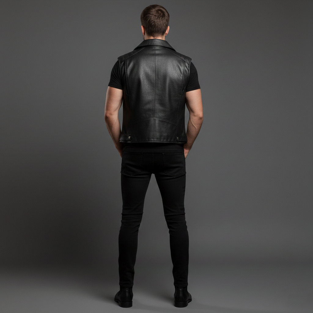 Men’s Premium Black Leather Biker Vest designed for bold modern styling.