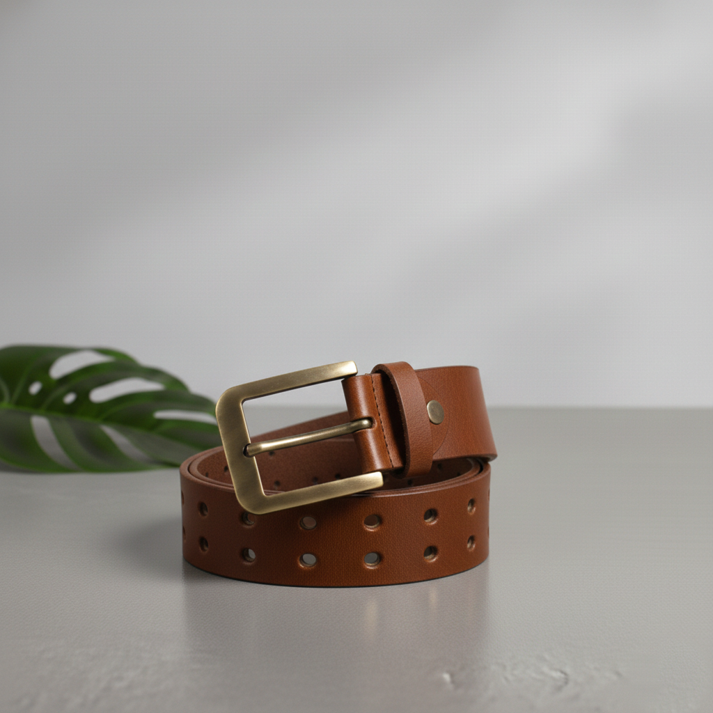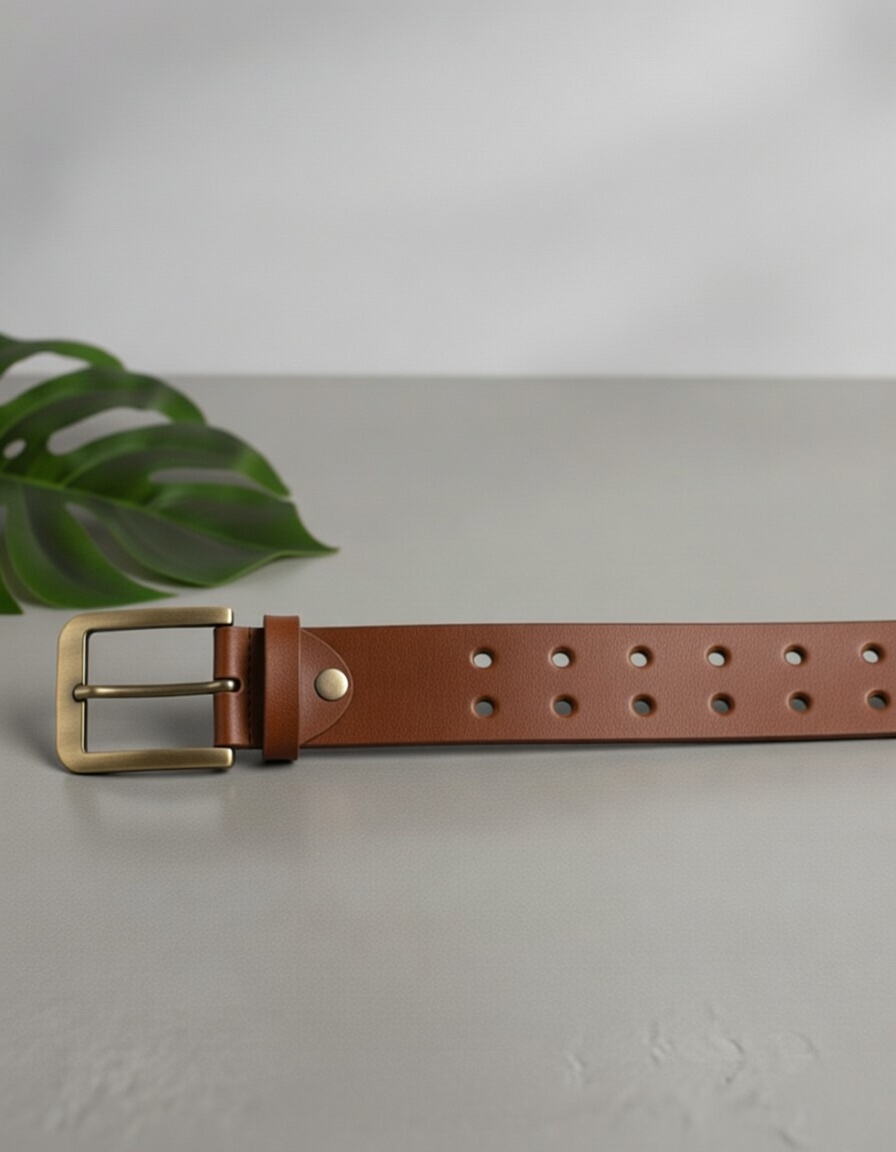Premium men’s brown leather belt featuring a durable antique brass buckle and modern perforated design. Crafted for everyday wear, it offers a comfortable fit, long-lasting quality, and a versatile style that pairs effortlessly with both casual and semi-formal outfits.