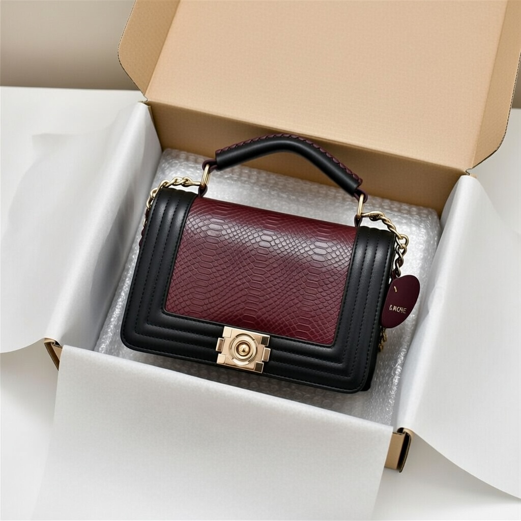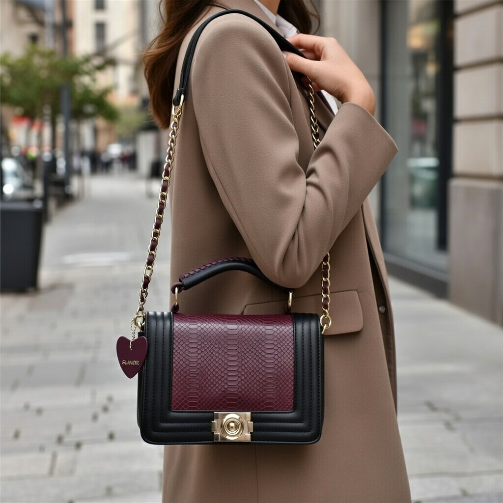 Elevate your everyday style with this elegant two-tone women’s handbag. Featuring a rich burgundy textured flap, sleek black body, and luxurious gold chain accents, this bag blends sophistication with practicality. Perfect for both casual outings and evening occasions.