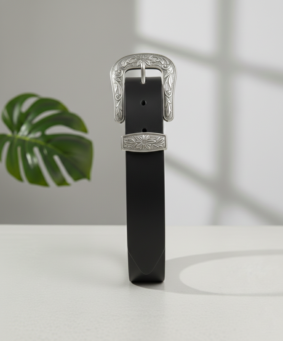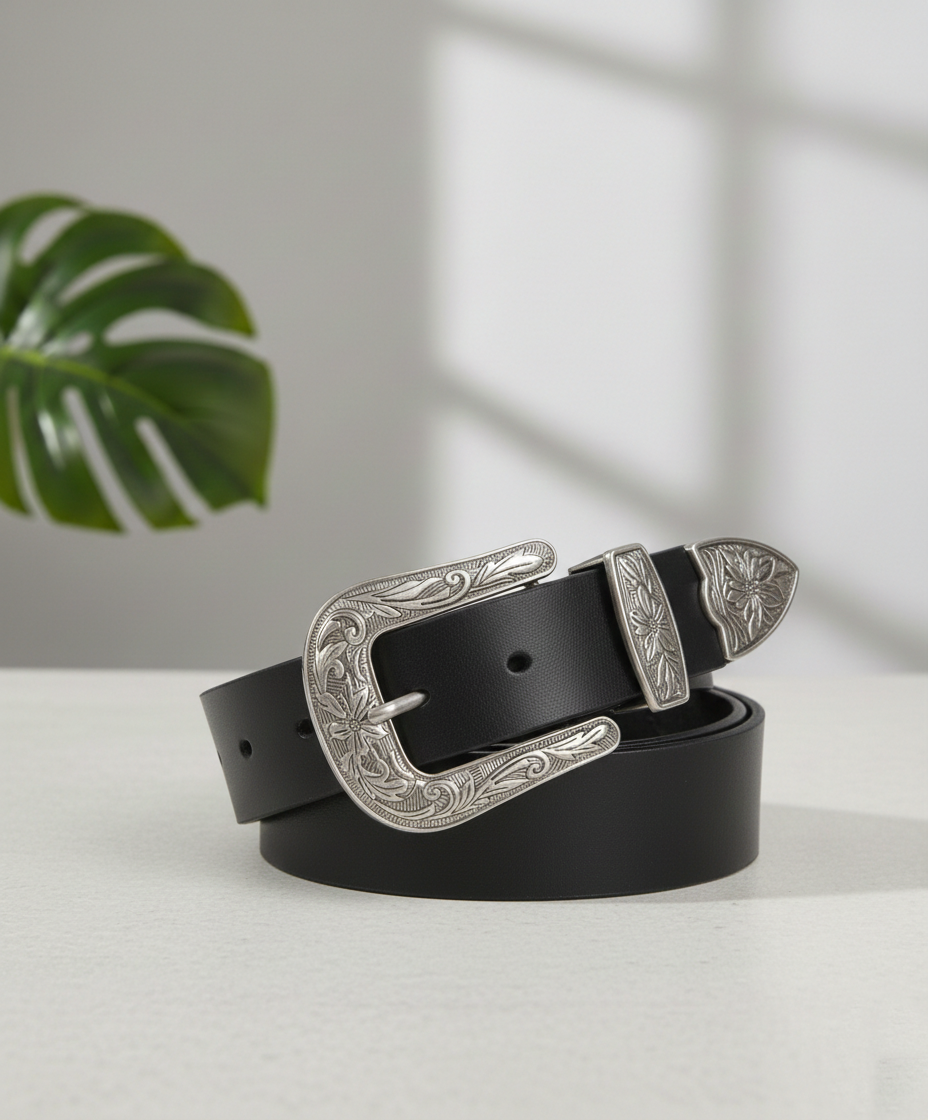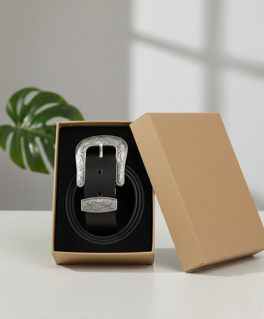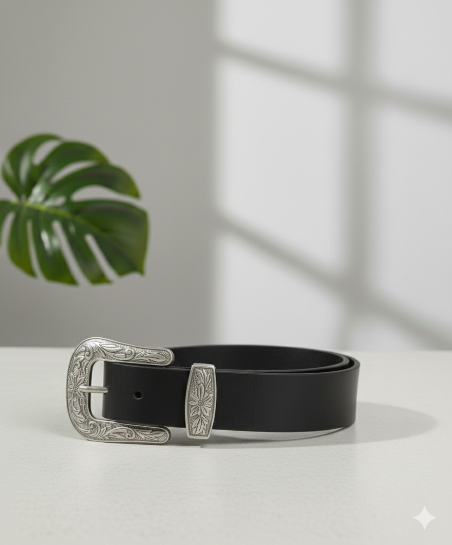 The premium leather construction offers a smooth, structured feel that holds its shape while remaining comfortable for all-day wear. The detailed floral engraving on the buckle and keeper adds a refined artisanal touch, making this belt equally suited for casual outfits or polished ensembles.
